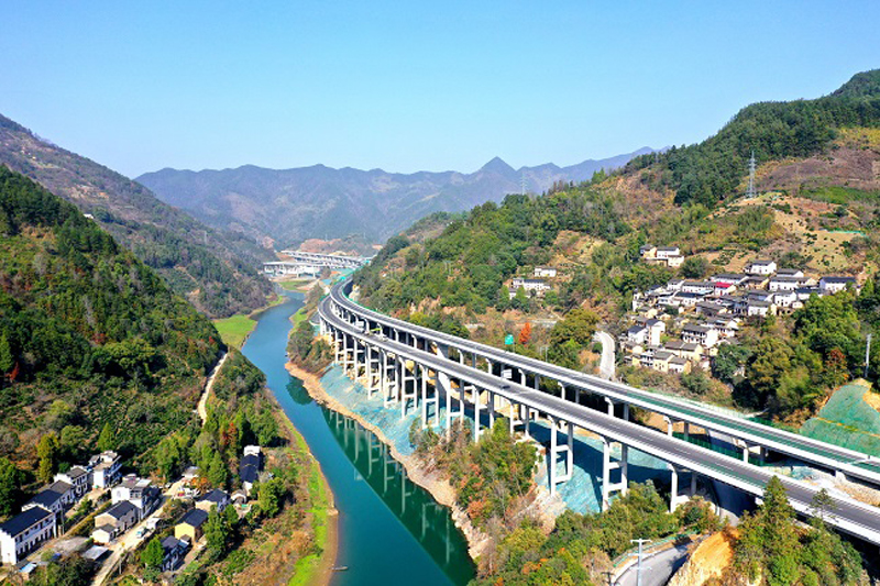 黄千高速武阳互通桥梁部分墩台位于水淹滩涂地,需筑岛施工,最大墩高超 45 米,最大支架高度 40 米,是安徽省建设难度最高的高速公路互通工程