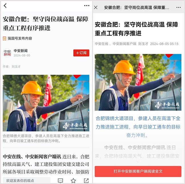 连日来,合肥持续高温天气,学习强国、中安在线报道建工建投集团安建交建公司所属各项目采取调整劳动作业时间、加强防暑降温等措施,保障重点工程建设有序推进。