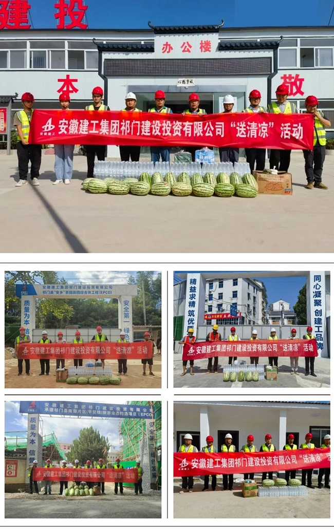 在F012塔坊至平里公路改建工程项目、“安乡”茶园田园综合体工程项目、南部片区(平里镇)旅游业态打造项目、祁门经济开发区低碳科创园基础设施项目、电商物流产业园项目、梅城大厦建设工程项目的施工现场祁门建投领导班子为一线工作人员送去绿豆、人丹、十滴水、西瓜、矿泉水等防暑降温物品,对高温下坚守一线的员工表示诚挚的慰问和衷心的感谢,叮嘱大家要注意休息,提高自我保护意识。同时,要求项目管理团队要认真落实好防暑降温各项措施,备足备齐防暑降温物资,守牢安全生产底线,合理安排工作时间,采取减少高温时段室外作业、轮换作业、减轻劳动强度等措施,把防暑降温工作落到实处,确保一线员工的身体健康和施工生产安全有序推进。