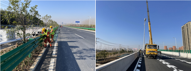 G312快速路项目施工现场,工人们紧张有序调度各项设施设备安装,加班加点完成道路护栏和路灯的安装工作,精确完成路面每一节标线的划定。寒冬低温下,工人们始终坚守在一线默默付出,全力冲刺年度生产目标。
