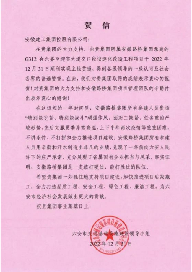 2022年12月31日,六安市交通基础设施建设领导小组发来贺信,对公司承建的G312快速化改造工程在元旦前夕顺利实现主线贯通表示热烈祝贺!