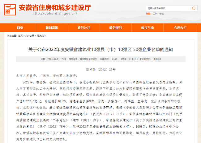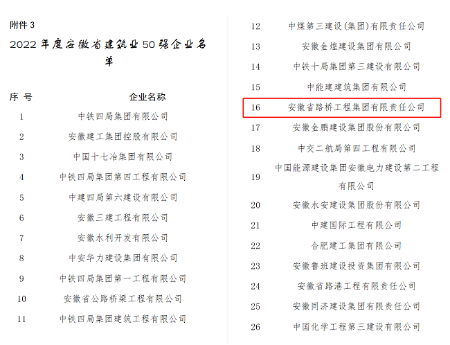 近日,省住房和城乡建设厅公布《2022年度安徽省建筑业50强企业名单》,安徽路桥集团再次荣登榜单,位列第16位,较上一年度上升5位。合肥市蜀山区召开高质量发展暨“一改两为”推进大会,公布了“2022年蜀山区建筑业十强企业”榜单,安徽路桥集团再次入选。频获殊荣,标志着公司综合实力、行业竞争力、品牌影响力的再次提升。