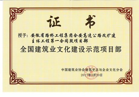 近日,由公司承建的合安高速改扩建主体工程第一合同段项目荣获首批“全国建筑业文化建设示范项目部”称号。该奖项是由中国建筑业协会、中建协建筑史志与企业文化分会共同评选颁发,首批共授予55个项目“全国建筑业文化建设示范项目部”称号。