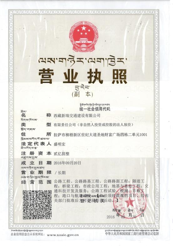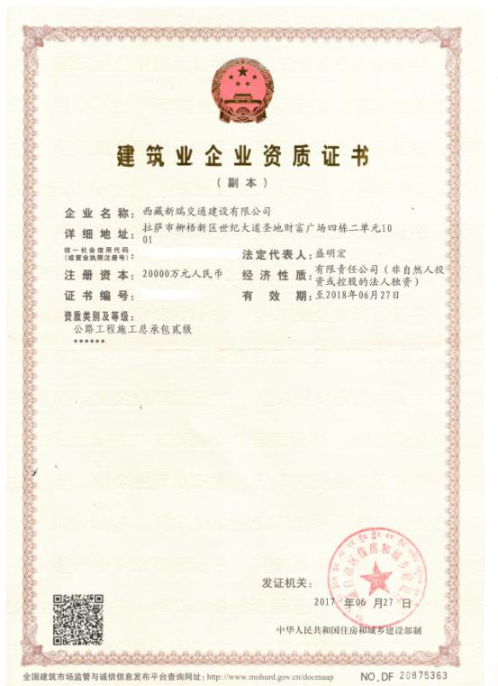 近日,公司全资子公司西藏新瑞交通建设有限公司收到西藏自治区住建厅下发的资质证书,喜获公路工程施工总承包贰级资质。
