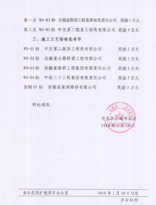 1月18日,合芜改扩建项目办传来喜讯:项目办2018年1月9号-10号开展的第四季度综合考评工作中芜合高速改扩建03标项目部取得了第一名的好成绩。