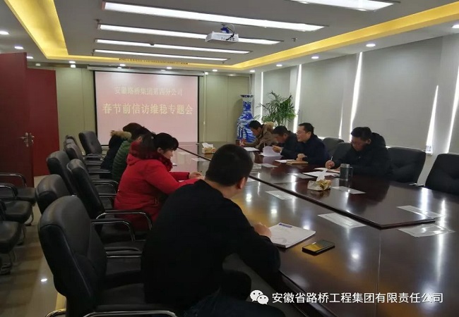 2月1日中午,四分公司在企融国际大厦16楼会议室召开了春节信访维稳专题会议,会议由四分公司党总支书记、工会主席朱大俊主持,分公司领导班子及相关项目经理、各部门成员参加了会议。