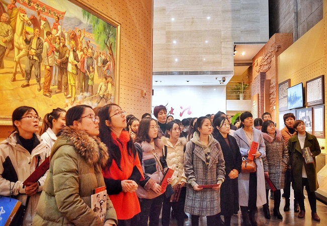 在一件件珍贵的革命文物前,在一个个牺牲英烈的姓名前,在英雄少女马毛妹雕像前,女同志们不时驻足凝望,敬畏之情在内心深处久久激荡,在巨幅“胜利之师”浮雕下,大家用注目礼深切向革命先烈们致以最崇高的敬意。