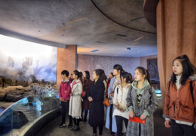 钟山风雨起苍黄,百万雄师过大江。渡江纪念馆面向浩瀚巢湖,犹如一艘乘风破浪的巨型战舰。馆内按展览的内容分为风雨苍黄、天翻地覆、人间正道、胜利之城四部分,以影像、实物、图片和文字等形式描述了百万雄师过大江的战斗场面,同时还展出相当多的渡江中的珍贵文物,伴随着生动的解说,大家真切感受到了解放军万船齐发勇渡长江的英雄气概和军民一心的鱼水深情。
