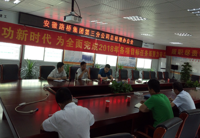 5月27日下午,三分公司在合安高速改扩建工程第一合同段项目会议室召开6月总经理办公会。会议由三分公司党总支书记、总经理鲍建新主持,三分公司领导班子全员参加、项目管理部工作人员与会记录。