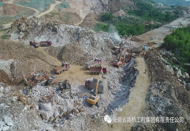 天石钙业地处新杭服务区上行段,桩号K8+600-K8+800。这短短的200米范围内遍布着硬质石山、低压杆线、采石矿场、居民住房等,推进难度十分巨大,为了加快进度,项目部决定采用双向推进的方法,由大小桩号同时向中间开挖,投入大量机械,提高施工效率。由于该段内多硬质石山,必须采用爆破开采,受限于政府的炸药管制政策,工作开展较慢。为此,项目部积极与政府有关部门沟通协调,最终获得了炸药使用权,并采用超深孔爆破的方法大大提升了开采速度。针对断点内的杆线、房屋问题,项目部积极协调,配合政府部门拆除红线内房屋,并在获得相关部门批准后,自行组织人员机械对杆线进行迁移,扫清了工作推进中的拆迁问题。