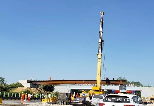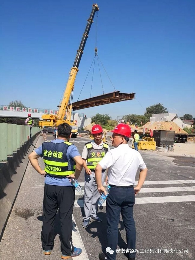 7月18日,芜合高速公路改扩建三标董湾桥上跨分离钢组梁吊装架设顺利完成。公司党委委员、副总经理钱叶琳及高速公路一路三方亲临现场督导指挥。
