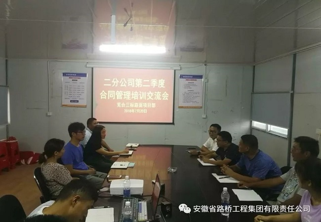 7月20日晚,二分公司第二季度合同管理培训交流会在芜合高速03标路面项目部召开。会议由芜合高速03标路面项目经理李健、副经理葛继银主持,芜湖东项目负责人曹军主讲,各项目合同管理人员参加会议。