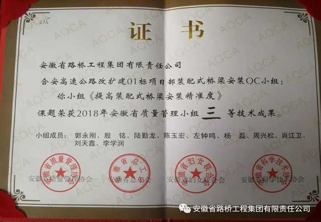 由公司选送的《提高装配式桥梁安装精准度》 QC小组课题荣获2018年安徽省质量管理小组三等技术成果。装配式桥梁尚属于公路桥梁施工研究阶段,此次QC小组活动成功解决墩柱安装存在的主要问题,为后续装配式桥梁施工提供了良好的施工经验,赢得了业主和监理单位的好评,提升了企业形象,取得了良好的社会效益。