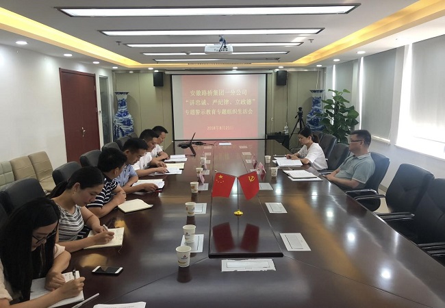 根据安徽路桥集团党委《关于在安徽路桥集团“讲忠诚、严纪律、立政德”专题警示教育中召开专题组织生活会的通知》的部署要求,一分公司党总支于8月21日在企融国际16楼会议室召开“讲忠诚、严纪律、立政德”专题警示教育专题组织生活会。会议由一分公司党总支副书记、工会主席汪永奇主持,一分公司党总支委员及机关全体党员参加会议。公司党委委员、纪委书记、工会主席王胜利,党委工作与人力资源部副主任徐慧玲到会指导。