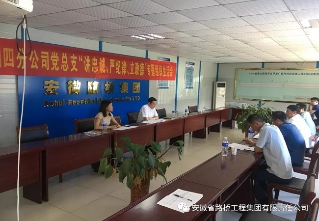 7月18日下午,四分公司党总支在广德S215-02标项目会议室召开“讲忠诚、严纪律、立政德”专题织生活会。会议由党总支书记朱大俊主持,四分公司党总支全体委员参加。公司党委书记、董事长、总经理盛明宏,党委工作与人力资源部副主任徐慧玲到会指导。