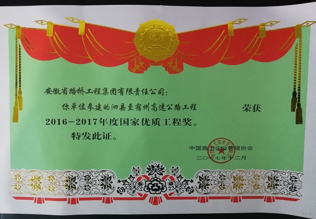 近年来,公司内抓管理、外拓市场,承建了一批具有代表性的工程项目,施工能力和工程质量得到社会各界的广泛认可,安徽路桥集团的美誉度和影响力不断提升。此次获得国家优质工程奖,是对公司近年来注重质量,创新管理的高度认可。公司将继续弘扬精益求精的徽匠精神,为全省乃至全国奉献更多精品工程。