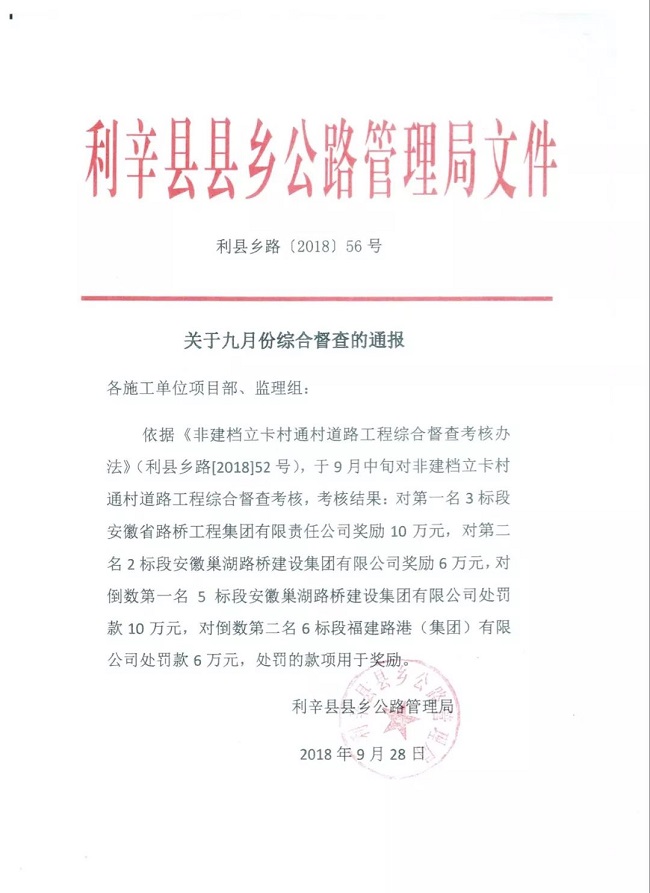 在刚刚结束的9月利辛县非建档立卡村通村道路工程综合督查考核中,公司承建的利辛县非建档立卡村通村道路施工3标段在全线6个标段中荣获第一名,并获业主奖励10万元,为接下来的四季度大干,圆满完成项目年度任务目标开了好头。