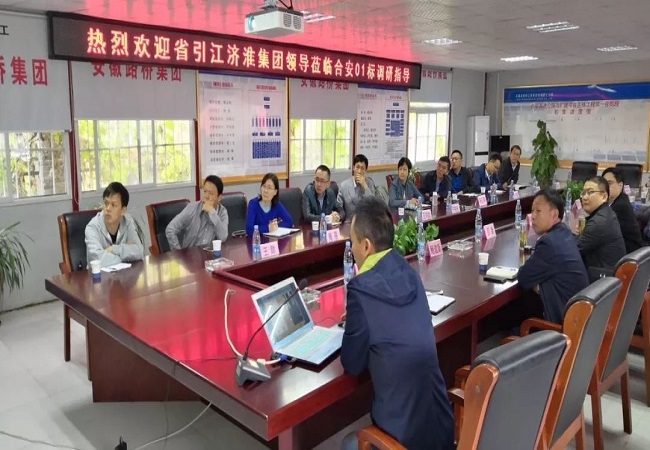 10月14日上午,安徽省引江济淮集团副总经理许晓彤一行莅临合安01标参观调研,并召开座谈会。公司党委副书记、总经理欧阳志宜,总经理助理、工程部经理卢军球,市场经营部经理邵康,三分公司党总支书记、总经理鲍建新陪同。