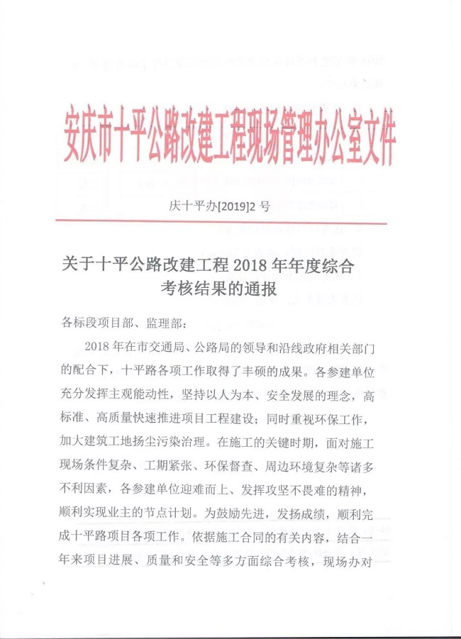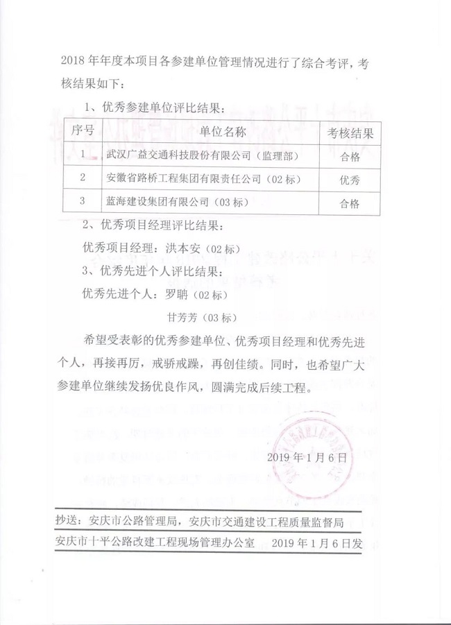 1月6日,我公司承建的安庆市十平公路改建工程项目在业主开展的2018年度综合考核中取得优异成绩。项目部被授予“优秀项目部”称号,洪本安同志被授予“优秀项目经理”称号,罗聃同志被授予“优秀先进个人”称号。