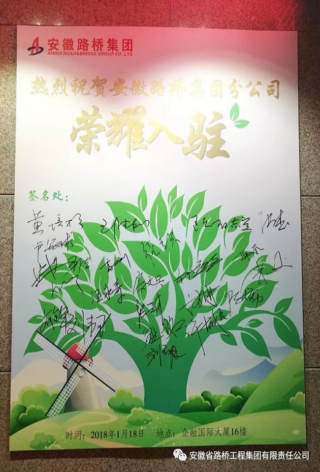 2018年1月18日上午8时38分,在一片喜庆热闹的气氛中,安徽路桥集团分公司入驻仪式在企融国际16楼举行。路桥集团领导班子部分成员、各分公司领导班子等参加仪式。