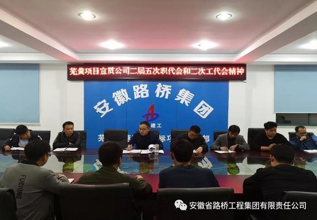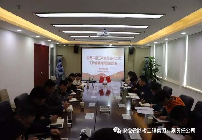 3月23日,二分公司党总支召开专题宣贯会,党总支副书记、总经理张立兵传达了公司职代会上党委书记、董事长盛明宏作的题为《不忘初心砥砺奋进 全力推动安徽路桥集团迈向新征程》的讲话和公司党委副书记、总经理欧阳志宜作的题为《坚定信心谋发展 继往开来谱新篇 为建成安徽省一流交通建设企业而努力奋斗》的工作报告。工代会代表带领与会人员学习了工代会上公司党委委员、工会主席王永来作的题为《围绕大局谋发展团结职工鼓干劲 为安徽路桥集团新一轮发展建功立业》的工会工作报告。