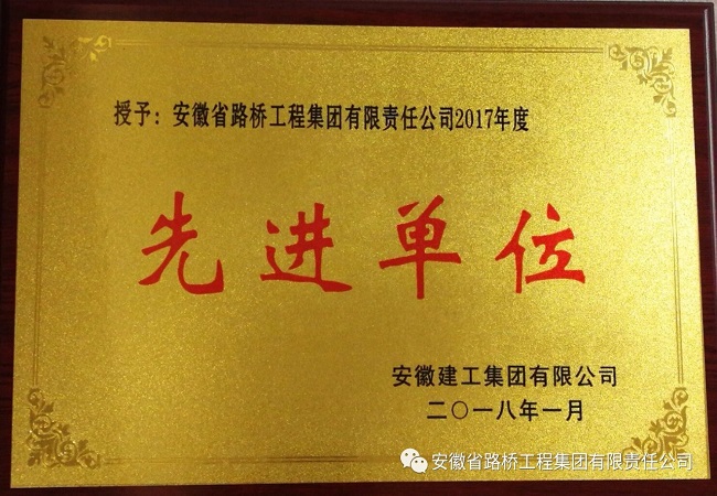 1月31日,在集团公司一届四次职代会暨2018年工作会上,安徽路桥集团被授予集团公司2017年度先进单位荣誉称号,这是公司连续两年获此荣誉。