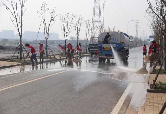 晴岚西路(开源路-迎宾大道)全长1200米,由于道路两旁树木刚刚迁移栽种,人行道上400多个树池旁堆有大量弃土未予以清理,项目青年员工冒着飞扬尘土,不怕脏不怕累,分工协作,迎难而上,对道路沿线垃圾、弃土进行清理,确保了道路沿线最终的干净整洁。