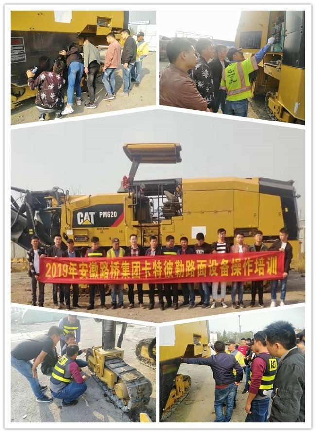 本次培训由卡特彼勒的管理工程师负责讲解授课。培训会分为两个部分:一是室内培训会,工程师重点讲解铣刨机概况及性能特点、操作安全及维护安全等相关注意事项、机械操作控制及技巧等;二是室外培训会,工程师带领学员们在合安项目深入学习PM620铣刨机上机实操。