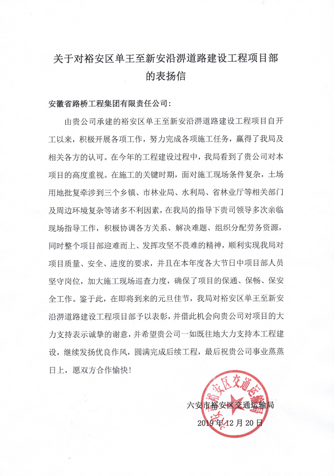 12月20日,一分公司裕安区单王至新安沿淠道路建设工程项目经理部收到六安市裕安区交通运输局发来的表扬信。信中高度赞赏安徽路桥集团裕安区单王至新安沿淠道路建设工程项目部迎难而上、攻坚不畏难的精神,充分肯定了项目部在质量控制、安全管理、施工进度等方面取得的成绩,并对公司为六安市发展作出的努力和贡献表示衷心感谢。