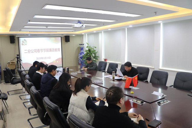 廉洁教育会上,二分公司机关及所属各项目部认真学习了省国资委纪检组《关于2019年下半年作风建设督查情况的通报》、《关于省属企业7起违反中央八项规定精神典型问题的通报》等文件精神,观看警示教育片《蜕变的初心》,以身边人身边事“近距离”教育广大党员干部,使广大党员干部引以为戒,受警醒、明底线、知敬畏。在机关廉洁教育会上,二分公司党总支书记刘峰同志要求党员干部强化思想自觉、政治自觉、行动自觉,做好自我管理,增强廉洁意识,严格落实中央八项规定精神,确保过一个欢乐祥和、风清气正的节日。