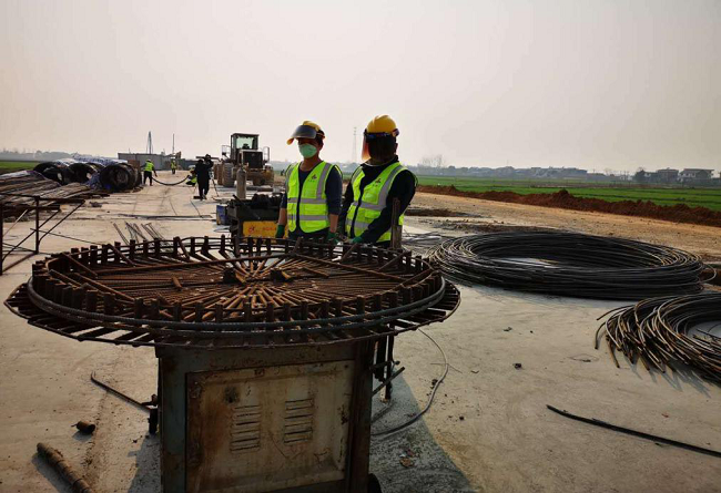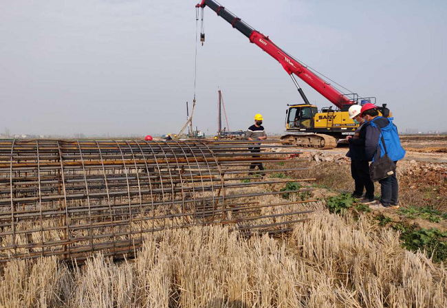 项目部及时编制复工方案和应急预案,积极与安庆市交通局、望江县政府、县交通局进行沟通,抗疫同时全力准备复工申请,2月23日望江县交通局对项目的复工申请进行了正式批复许可。2月25日,项目全面复工,杨湾河特大桥引桥桩基顺利开钻、主桥桩基钢筋笼制作、路基涵洞工程正紧锣密鼓开展,为优质高效地完成全年建设任务打下扎实基础。