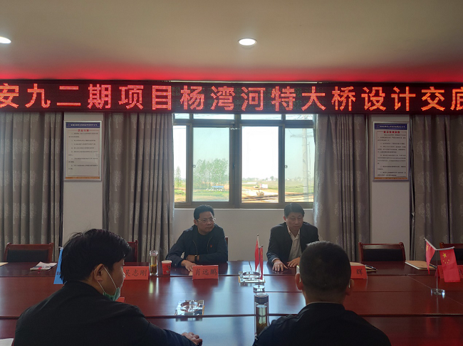 王耀明首先对杨湾河特大桥施工准备进展情况进行了解,随后主持召开了杨湾河特大桥施工图纸设计交底会,分别从项目概况、设计依据及标准、建设条件、设计要点、施工注意事项、其他事项六个方面进行了设计交底。