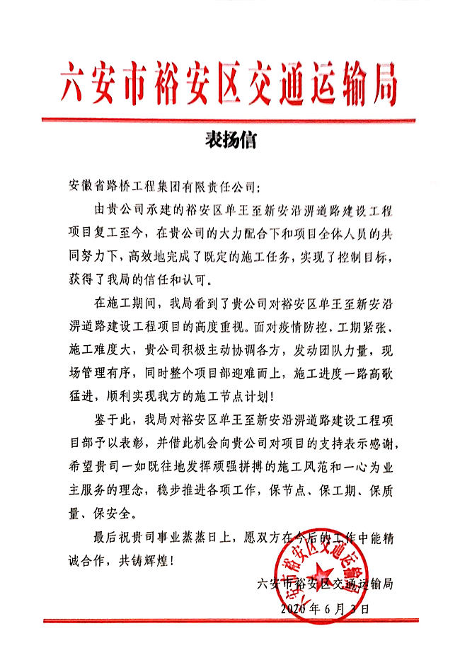 近日,一分公司裕安区单王至新安沿淠道路建设工程项目经理部再次收到裕安区交通运输局发来的表扬信。信中对项目部在疫情防控期间展现出的专业素质和敬业精神提出高度赞扬。