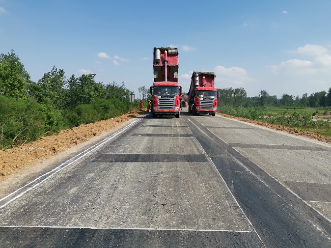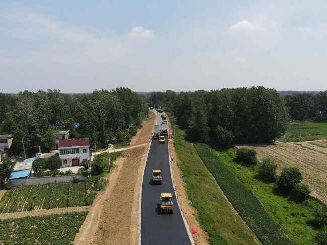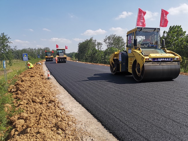 6月9日,裕安区单王至新安沿淠道路建设工程项目开始道路面层沥青摊铺工作。