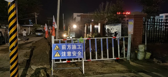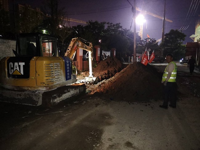 张桥口村落范围约300米,西接光明路,东至驻马沟。村内均是自建砂石硬化路,道路狭窄,管线复杂。项目部安排两台挖机从西向东,两条排水管沟同时开挖,经过12小时的努力,7月17日8时,项目完成680m管沟开挖。此后,又耗时4个小时,将村内原有排水沟经光明路人行道外侧与新建管沟连通。