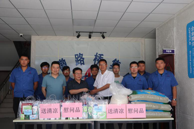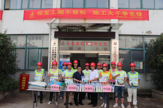 在慰问现场,刘书记提出两点要求:一是项目部要灵活安排现场作业时间,认真落实防暑降温措施,确保一线职工的身体健康和施工安全,进一步落实安全生产责任制,确保各项建设工作顺利进行;二是连日来受强降水影响,部分地区造成严重洪涝灾害,项目部要提前制定防汛应急预案,确保项目人员生命安全,减少公共财产损失。在做好内部防洪工作的同时,要第一时间伸出援手,积极调配可用资源,全力参与到地方抗洪抢险中,彰显安徽路桥集团国企责任担当。