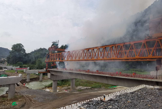 预制箱梁安装是项目施工中的重点工程。为确保首片箱梁的顺利架设,项目部提前着手,不断优化各项资源调配,并派出专业人员对架桥机及运梁车进行拼装和反复调试,确保硬件设备满足施工需要。项目主要领导深入一线,对箱梁架设的全过程实施统一计划、统一管理、统一监控、统一调度。在施工准备过程中,不断加强现场人员的技术及安全质量培训、严格抓好安全质量把控,确保架梁施工安全质量平稳可控;进一步完善施工专项方案,对作业班组进行系统的施工技术交底和安全技术交底;同时加强现场施工过程控制,认真落实施工方案,严格按照架梁规程操作,确保箱梁架设位置无偏差;科学统筹配置机械设备,不断优化箱梁安装的主要施工方法与技术控制,保证了此次架梁的顺利进行。