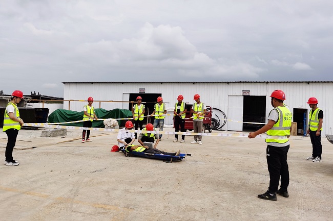 下午1:30分,演练正式启动。各组参演人员根据演练要求,按照“事故发生-紧急汇报-启动应急响应-各救援小组抵达现场-救援小组现场应急处置-医护人员抵达-医护人员专业救护-将参演伤员送上救护车”的流程进行演练。现场指挥得当,人员分工明确,整个过程紧张有序,应急反应与处理规范及时,总共历时约25分钟,顺利完成既定的应急演练任务。