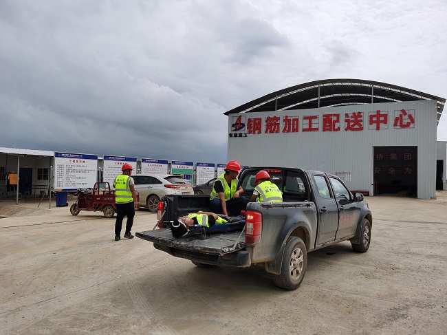 本次演练在项目预制梁场区域,模拟10吨龙门吊脱轨倾倒,龙门吊挂钩砸伤一名作业人员,造成机械设备事故伤害,项目部启动应急救援预案。