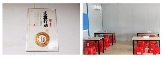 在一分公司所属各项目部餐厅内,“光盘行动、珍惜粮食”等标语牌十分醒目,同时利用电子显示屏和餐桌提示牌等形式,营造“浪费可耻,节约为荣”的氛围,引导大家树立节约意识,积极倡导“光盘行动”,养成节约用餐的良好习惯。