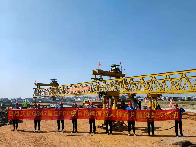 11月12日上午11时30分,随着现场架梁总指挥落梁指令的发出,一片长30m,重约100t的箱梁缓缓地落在0#~1#跨临时支座上,G347 PPP项目杨湾河特大桥引桥首片小箱梁顺利完成架设,自此揭开了项目桥梁上部结构施工的序幕。