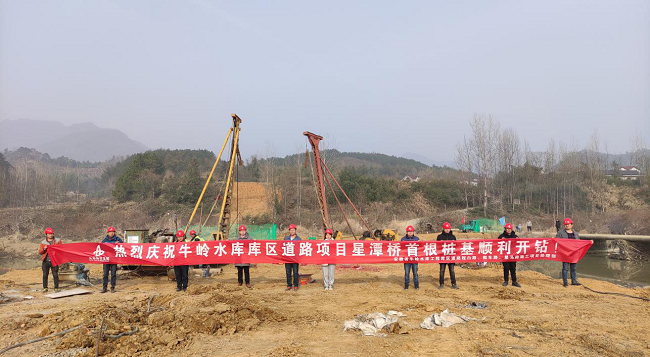 1月16日上午9点,牛岭水库库区道路施工项目星潭桥首根桩基顺利开钻。