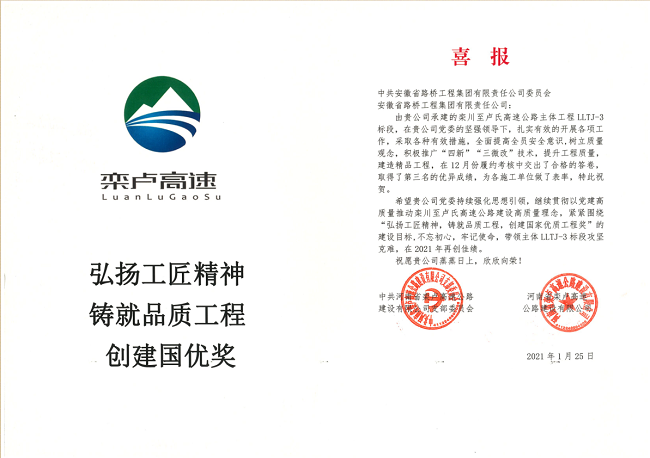 近日,河南栾卢高速公路有限公司给公司发来喜报,对公司栾卢高速公路土建TJ-03标项目部严标准、高质量的圆满完成年度施工任务表示感谢。
