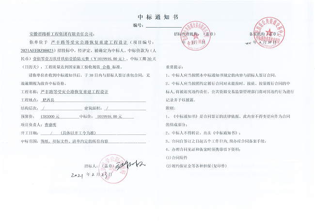 2月23日,设计总院成功中标合肥市肥西县严丰路等受灾公路恢复重建工程设计项目,取得新年开门红。