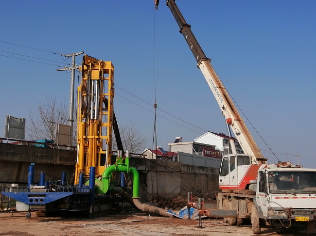 华阳河大桥主桥水中墩基础采用直径2.5m钻孔灌注桩,每墩横向双排三根布置,设计桩长63m-64.5m,采用泵吸式反循环钻进成孔,垂直导管法灌注成桩,速度快,效率高,成孔质量高。