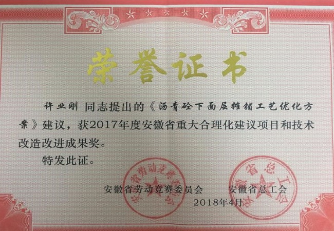 日前安徽省在庆祝“五一”暨“当好主人翁、建功新时代”劳动竞赛推进大会上,对劳动竞赛先进集体和先进个人进行了表彰颁奖。我公司许业刚同志提出的《沥青砼下面层摊铺工艺优化方案》荣获安徽省重大合理化建议项目和技术改造改进成果奖。