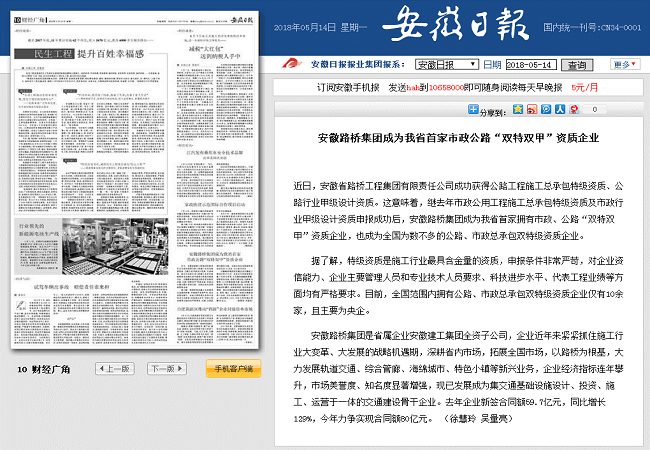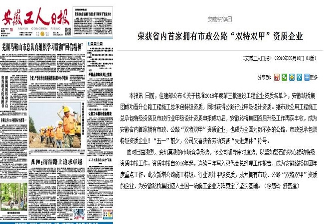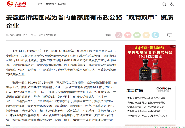 4月23日,人民网在安徽频道名企动态模块,以题为《安徽路桥集团成为省内首家拥有市政公路双特双甲资质企业》长篇幅报道公司抓住建筑企业变革和发展的机遇期,优化管理,开展特级资质申报等工作情况。