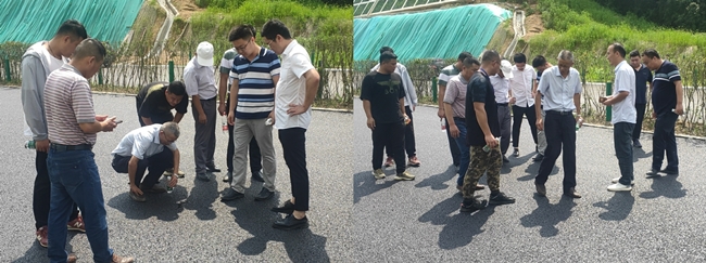 陆学元博士对现场摊铺、平整度、现场渗水、表面外观等给予了肯定,对加强道路下面层原材料控制,调整优化摊铺机布料、叶片等方面提出指导意见。