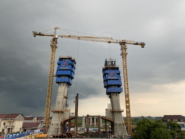 G347PPP杨湾河特大桥主墩两岸主塔分别进入到第五节和第六节施工,按照施工方案要求,主塔第一节到第五节之间共有二道连接系和一道主动支撑施工。
