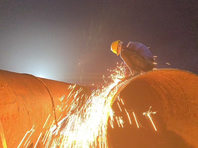 为了保证后期主塔和上横梁施工的顺利往前推进,在管桩加工安装之前,项目部对现场的施工技术人员进行了详细的技术交流和交底。项目部全体员工发扬连续作战精神,全力奋战在施工一线,鼓足干劲,抢抓工期。施工现场,白天机械轰鸣,夜晚挑灯夜战,参建人员放弃休息,不畏艰难,争分夺秒,以流水作业的方式进行钢管桩的连接、拼装和连接系的加工、安装等工作。同时,项目部备足了物资、机具、材料以及充足的防暑食品及药物,安排专人负责协调,保障职工的身体健康,为现场施工保驾护航。